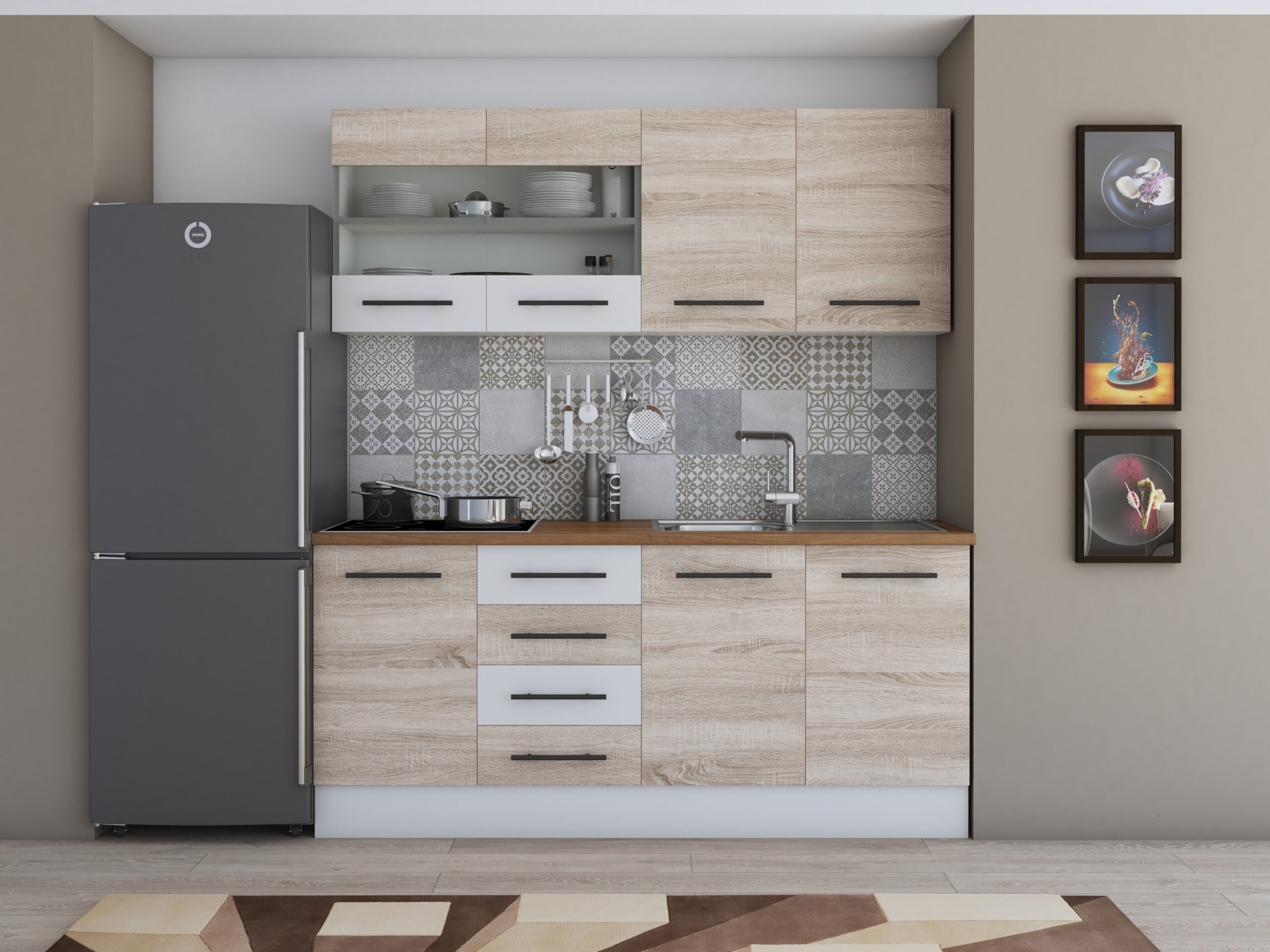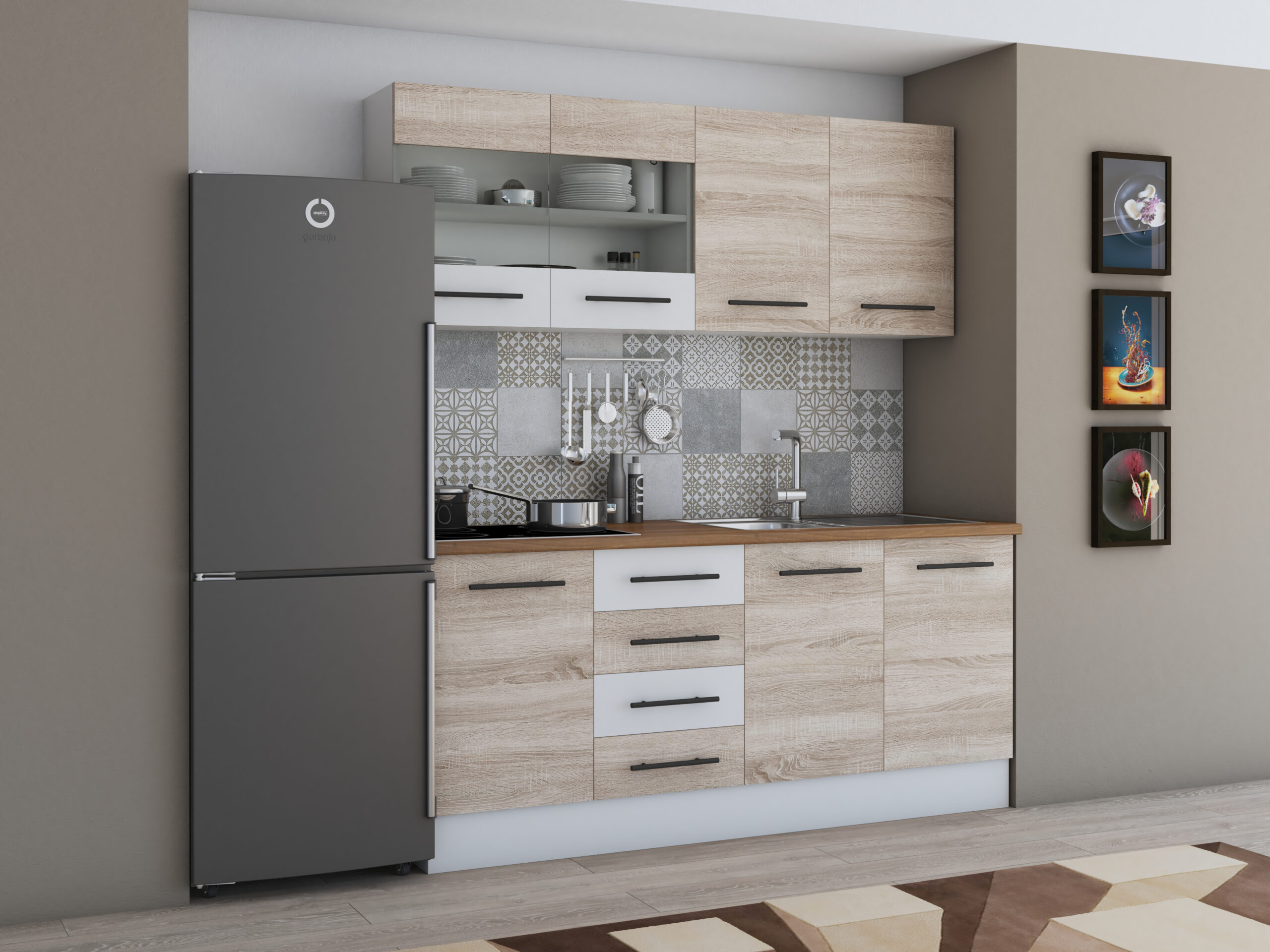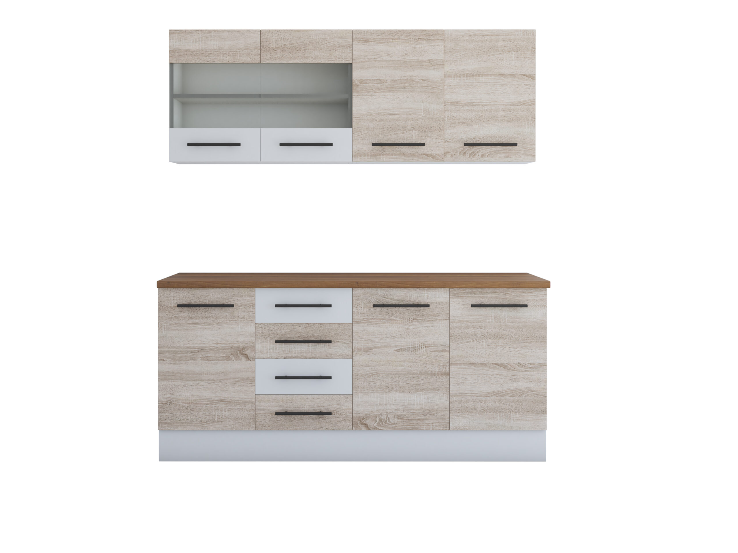 Bucatarie Alfa 180, cu vitrina, sonoma/alb, blat termic nuc