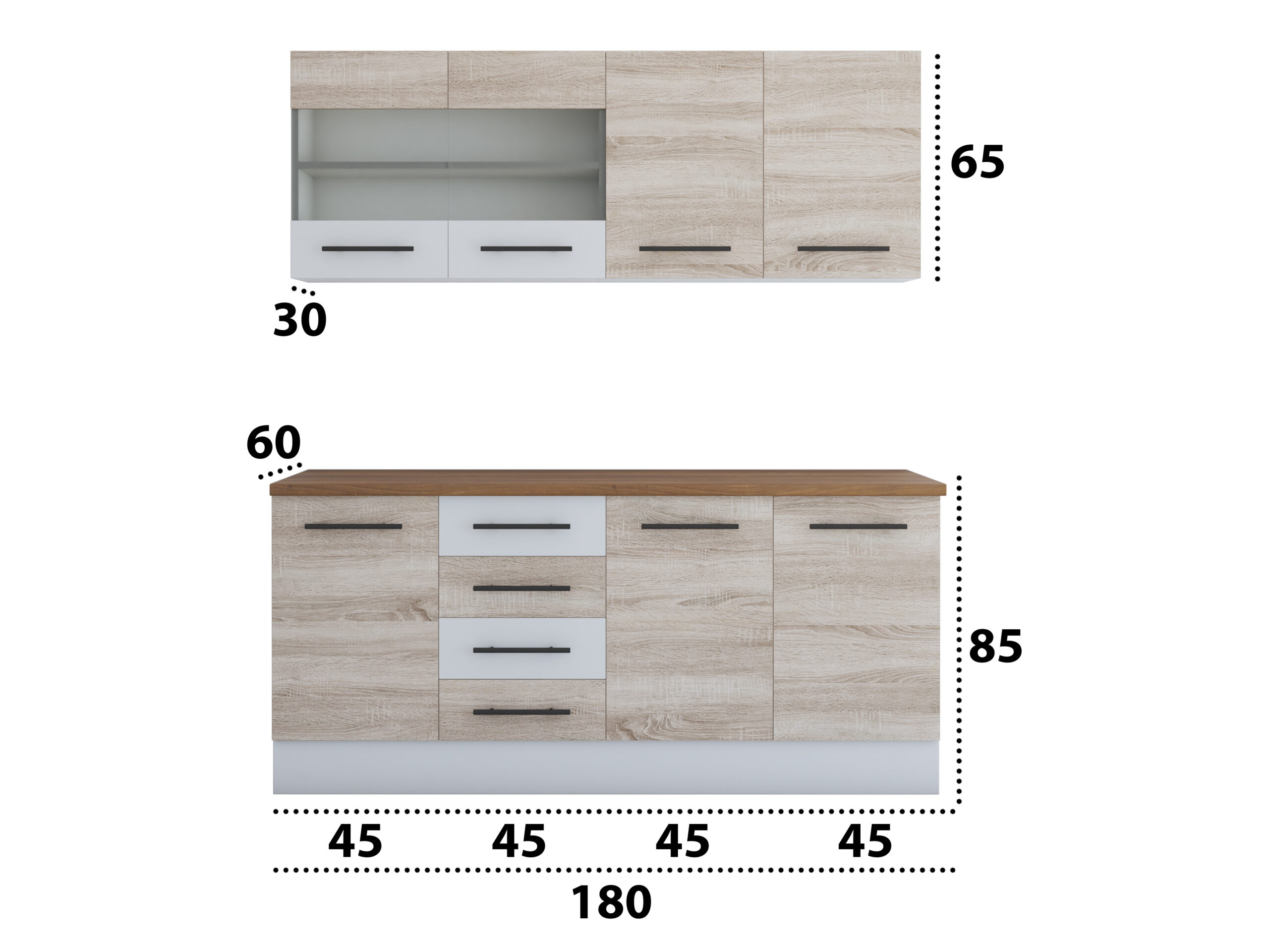 Bucatarie Alfa 180, cu vitrina, sonoma/alb, blat termic nuc: