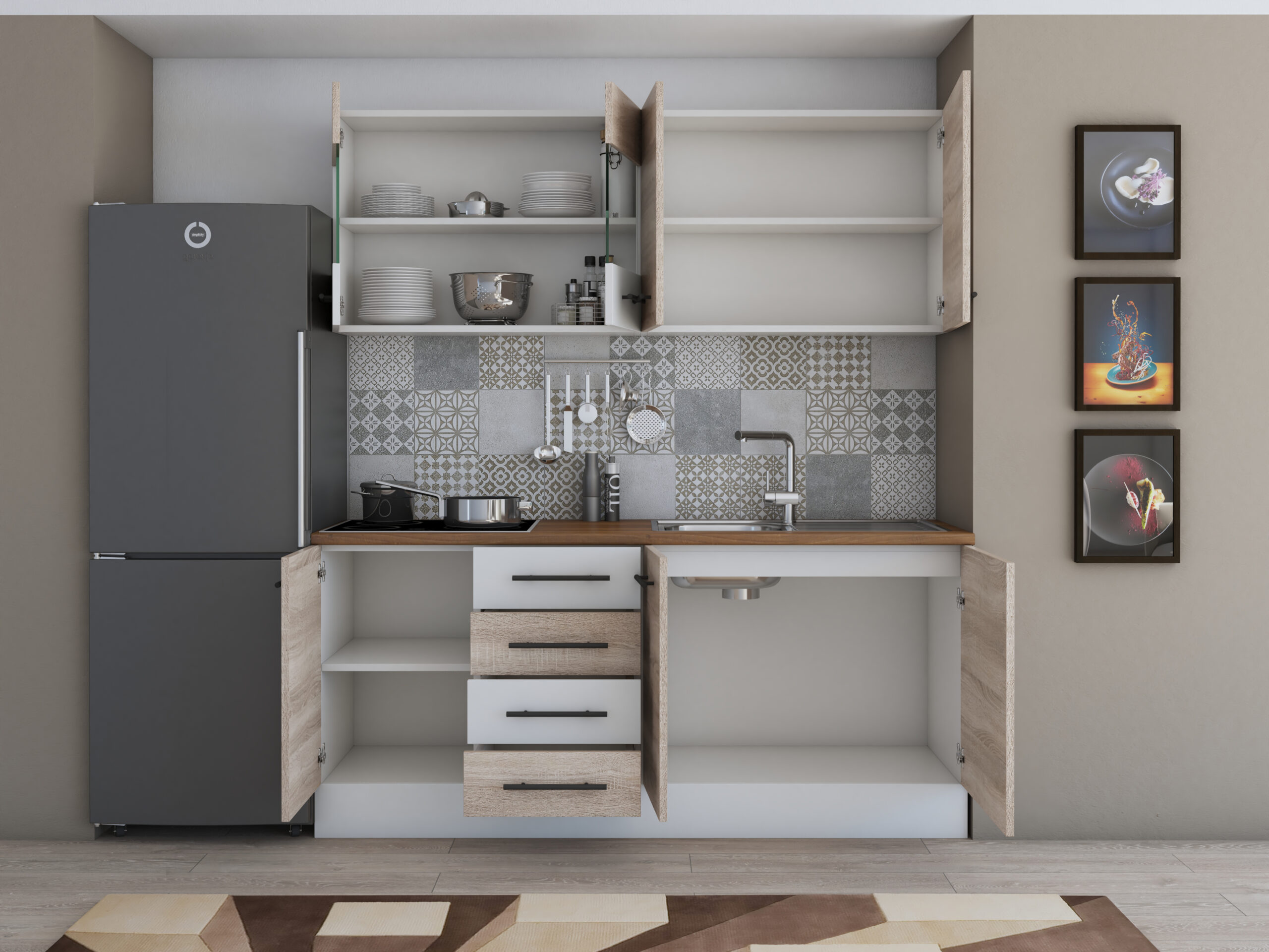 Setul este dotat cu multiple spatii de de depozitare, avand in componenta sa corpuri superioare si inferioare. Are un design modern deschizandu-se in functie de necesitati: stanga sau dreapta, astfel incat spatiul este eficientizat si valorificat.